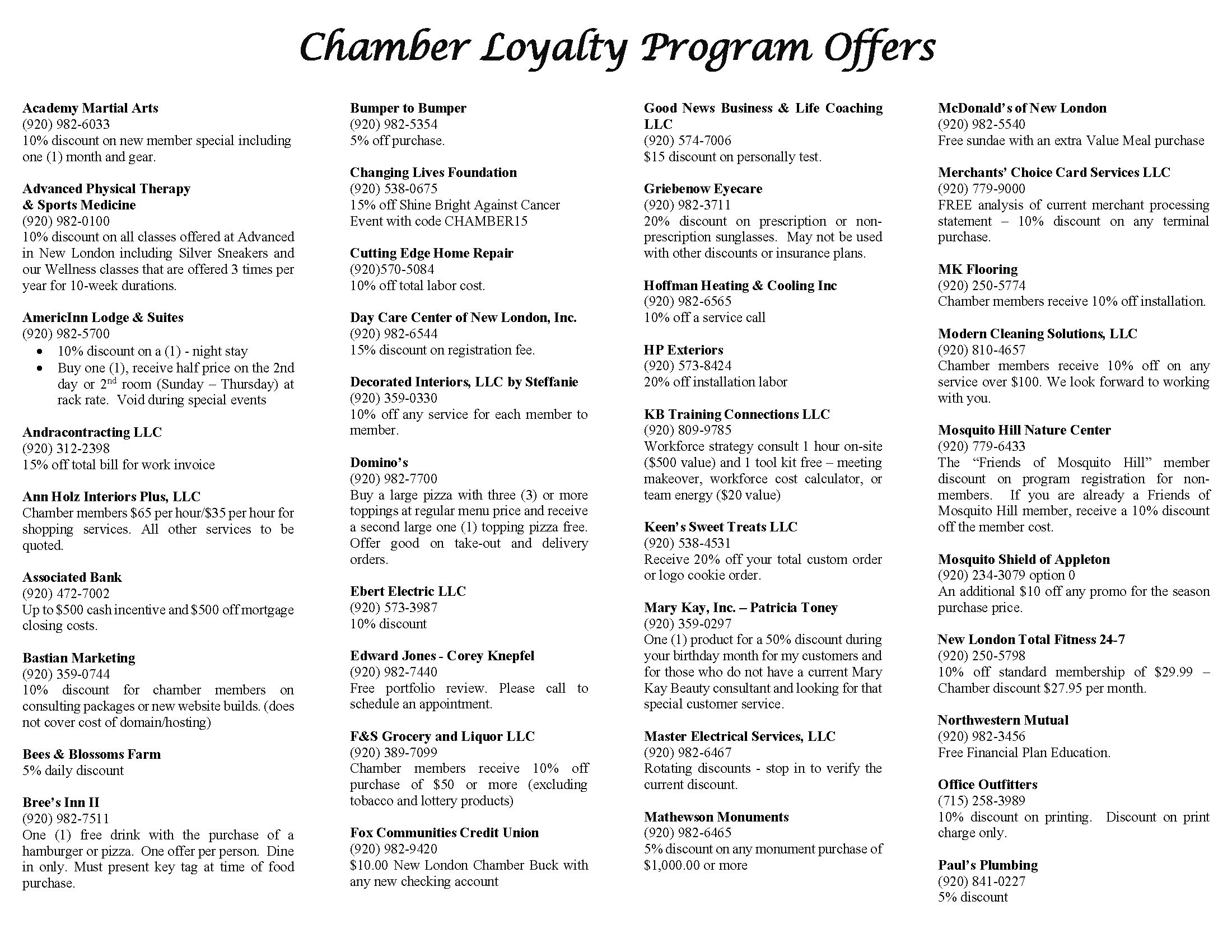 The Chamber Loyalty Program offers member-to-member discounts! This program has grown out of the desire to promote business growth among fellow Chamber members.
