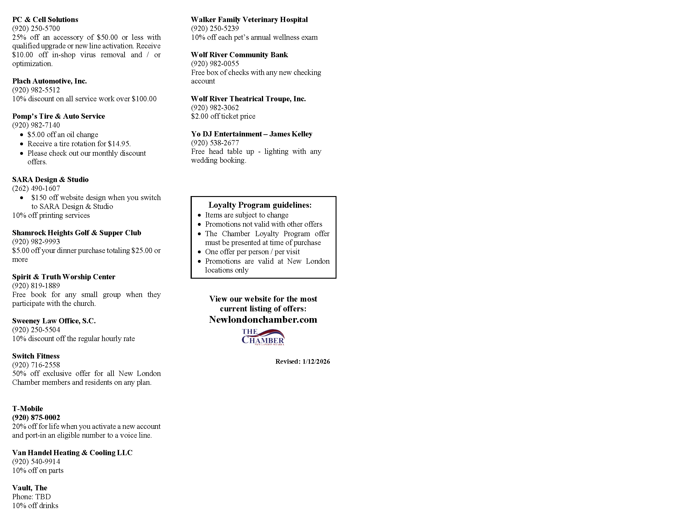 There is NO cost to participate in the New London Area Chamber of Commerce Loyalty Program. Your only expenditure is the discount you offer. In order to join the program, you must offer something unique to Chamber members; the appropriate discount is one not offered to the general public.