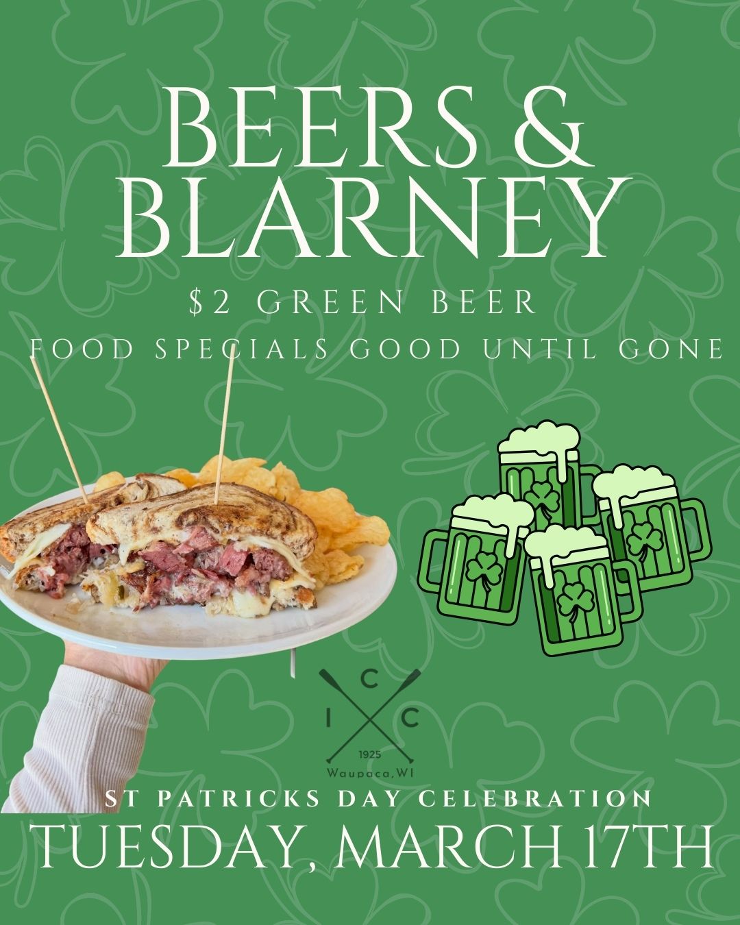 Join us for, “Beers and Blarney” beginning at 4pm. We will be serving up $2 Green Beer, delicious Rueben sandwiches and corned beef hash (along with our regular menu as well!)
