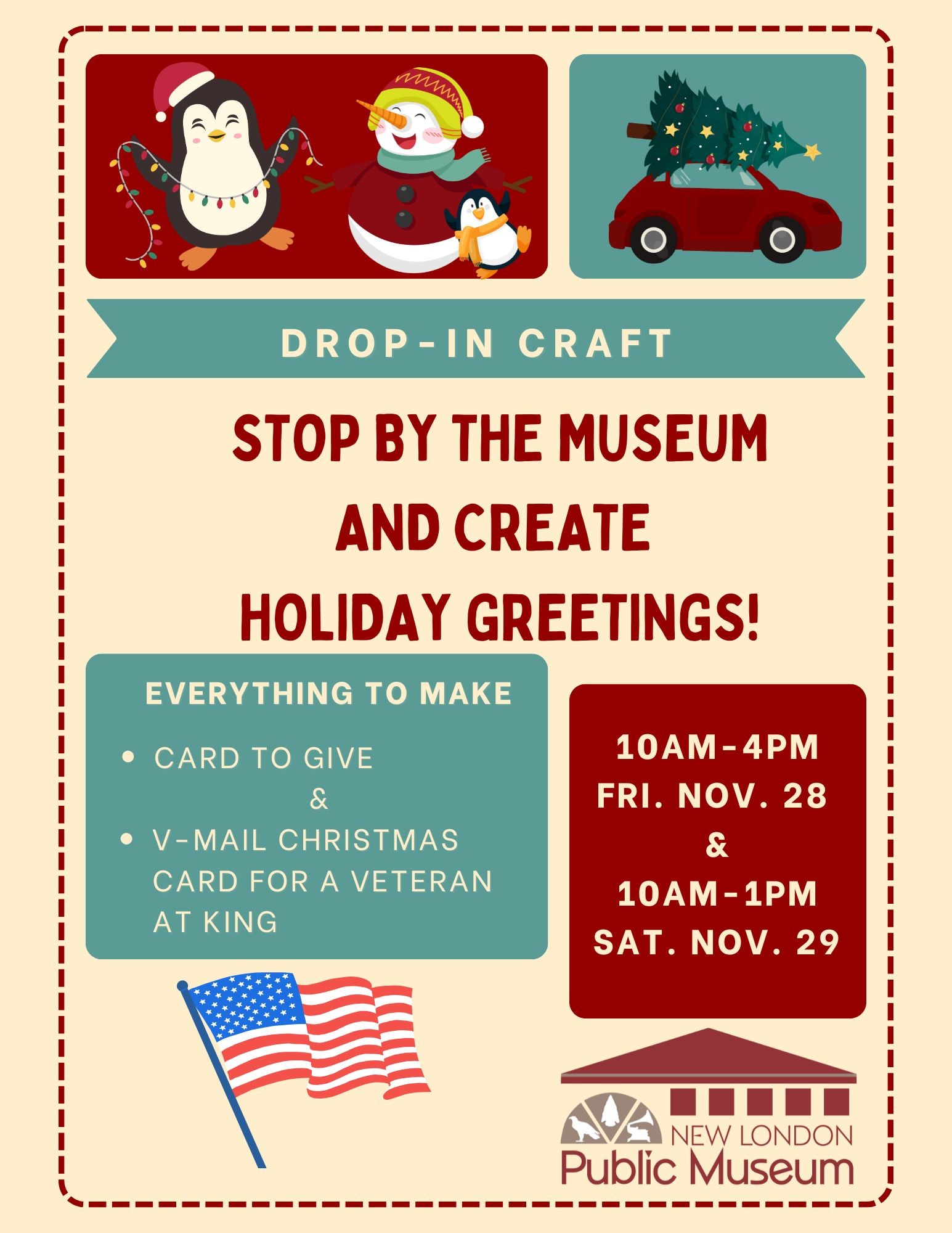 Stop in this Friday & Saturday to make a Holiday card for yourself and a V-Mail Christmas Card for a Veteran at King. All the materials will be supplied.