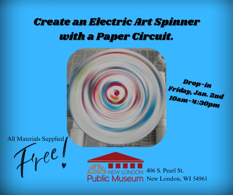New London Public Museum New London, Wisconsin, United StatesDrop-in at the New London Public Museum on Friday, Jan 2nd, 10am-4:30pm to create an Electric Art Spinner! Come create an Electric Art Spinner with a Paper Circuit. Let your creativity shine while learning how electricity and circuits work. Free Admission No Reservation Required Recommended for ages 8 years old and above 406 S. Pearl […]