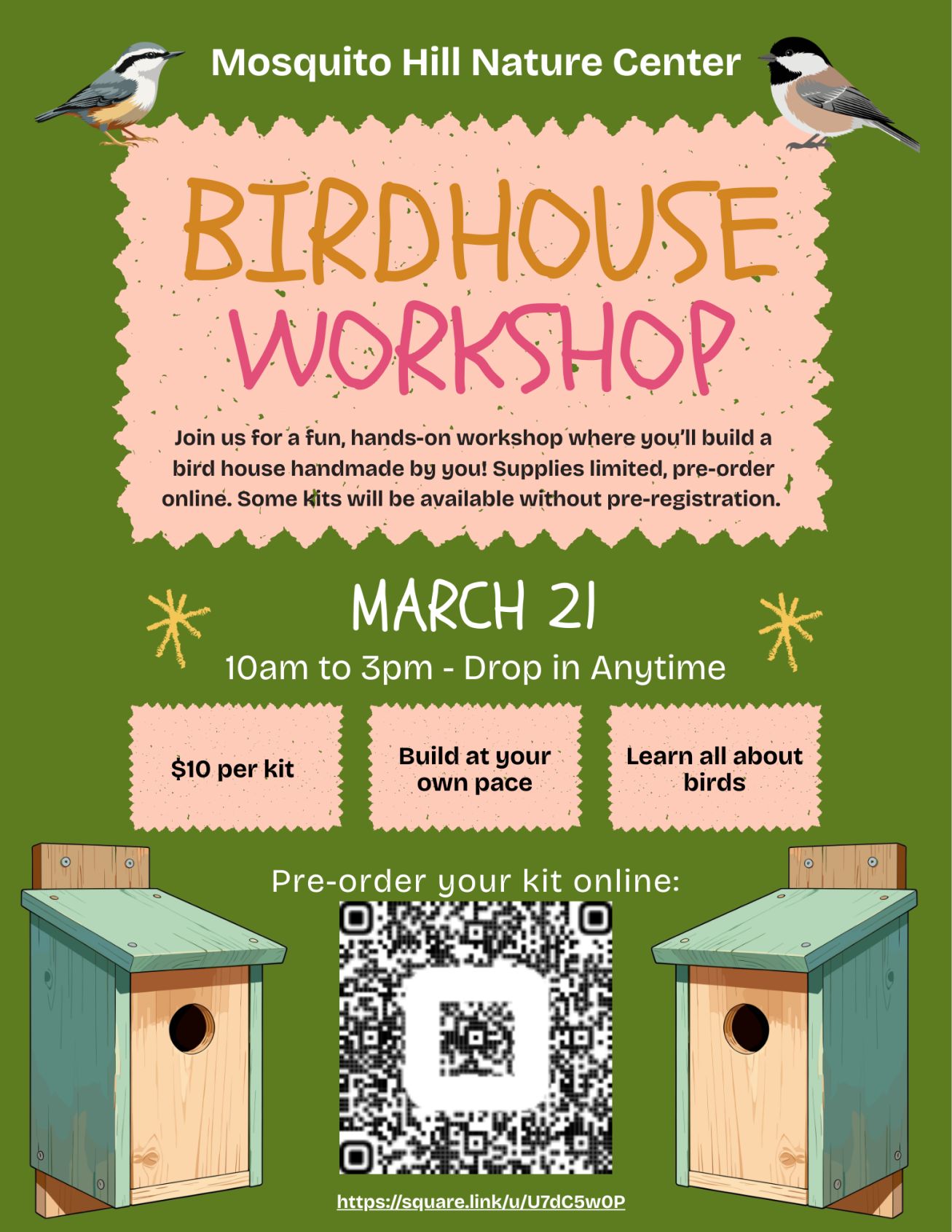 Join us for a fun, hands-on workshop where you’ll build a bird house handmade by you! Supplies limited, pre-order online. Some kits will be available without pre-registration. $10 per kit.