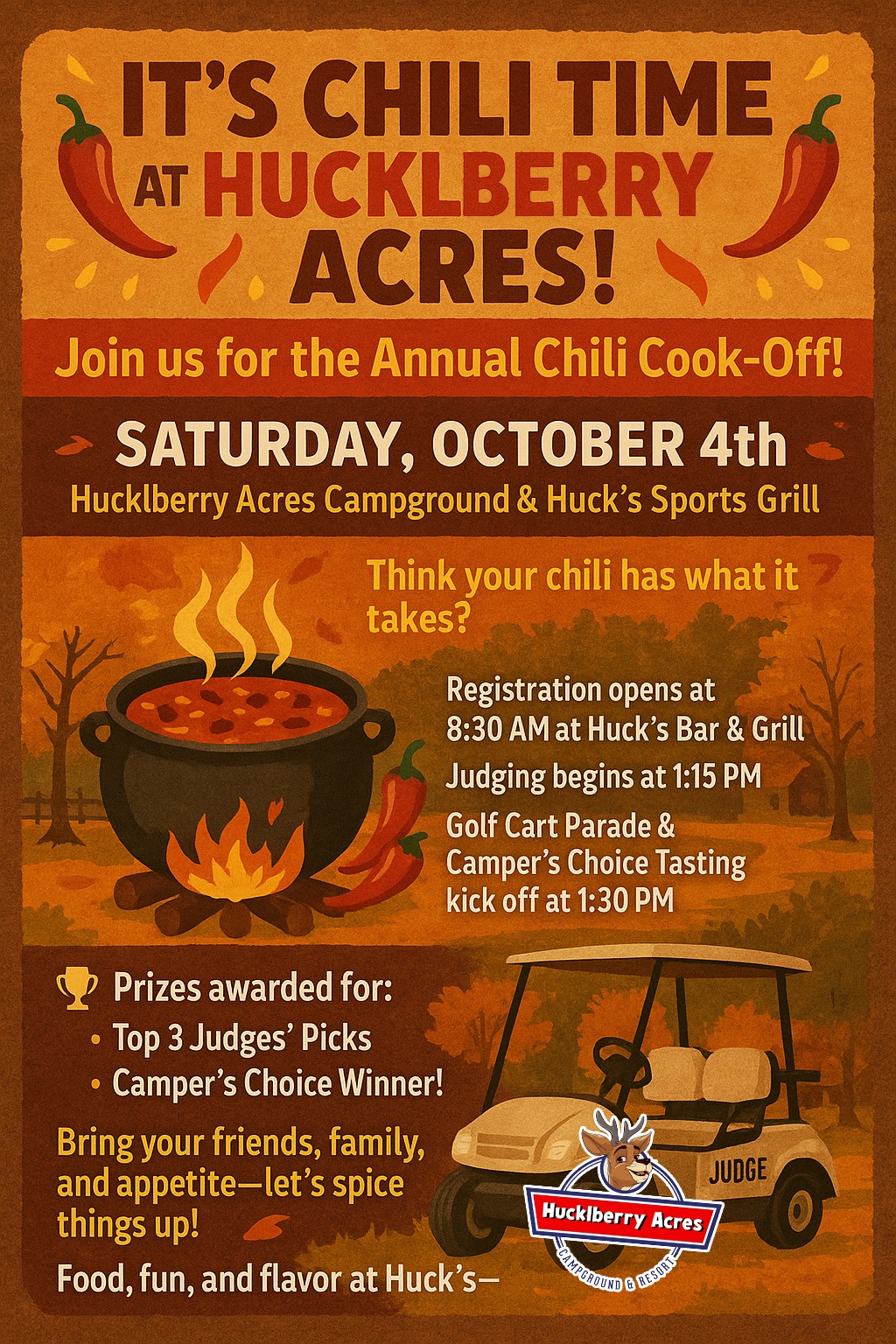 ![]() Mark your calendars! The Emanuel Lutheran Ladies' Aid is hosting a Fall Bazaar on Saturday, October 4 and Sunday, October 5. The bazaar will be held in our Fellowship Hall and will be open before and after worship services. Stop by on Saturday from 4-7 pm or on Sunday from 8 am to 12 pm. […] ![]() IT’S CHILI TIME AT HUCKLBERRY ACRES! Join us for the Annual Chili Cook-Off! Saturday, October 4th. Hucklberry Acres Campground & Huck’s Sports Grill. Think your chili has what it takes? Come stir up the heat and compete! Registration opens at 8:30 AM at Huck’s Bar & Grill. Judging begins at 1:15 PM. Golf Cart Parade & […]