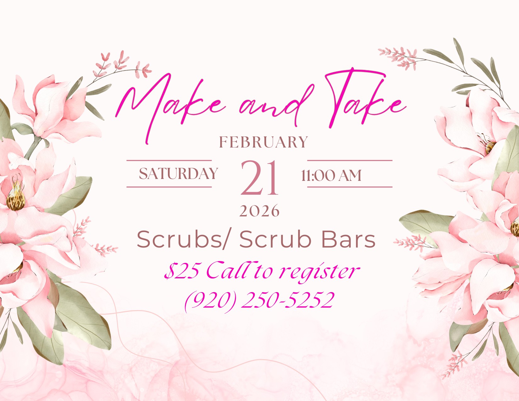 Come in to learn how to make your own Scrubs and Scrub Bars. Jess will show you the basics and you will leave with 4 items you can keep for yourself or give as gifts to pamper this winter skin. Call (920) 250-5252 to register today.