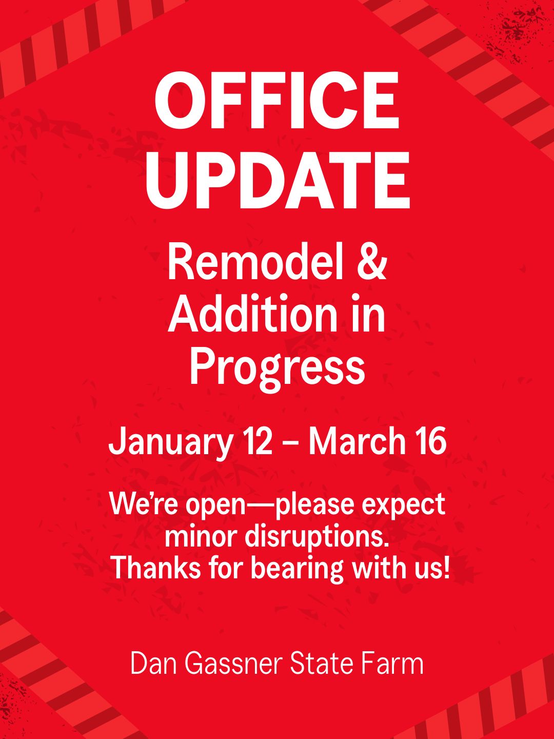 Exciting changes are coming! Starting Monday, January 12, through March 16, our office will be undergoing a remodel and expansion. We’ll remain open during construction, but you may experience minor disruptions during your visit. Thank you for your patience — we can’t wait to share the finished space with you!