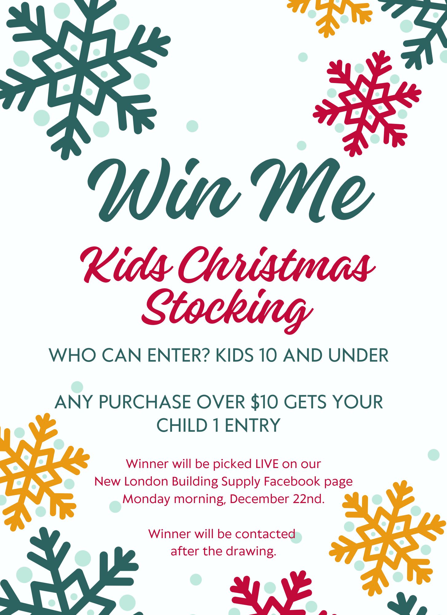 We have a 6-foot stocking filled with a variety of toys and games. Bring in your Children (10 years old and under) for a chance to win.
