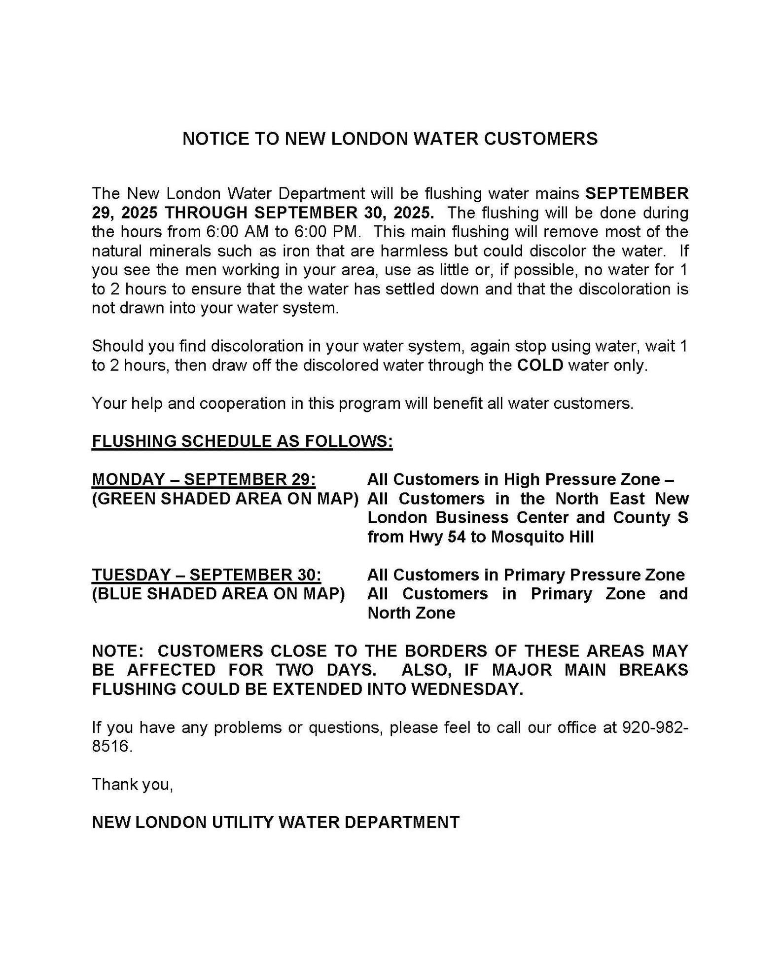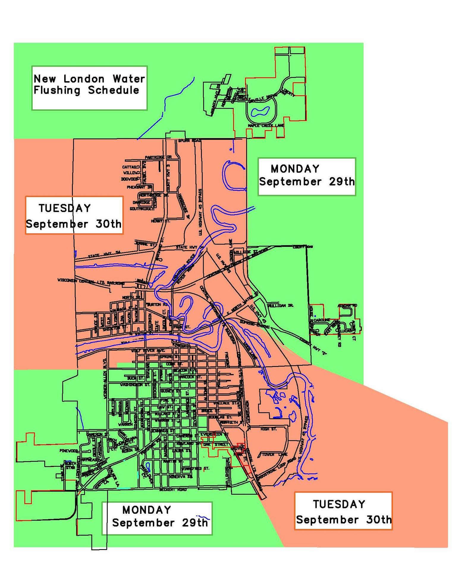 A reminder on behalf of New London Utilities that hydrant flushing is happening on September 29 and 30. Please refer to the map and informational sheet below for all details.