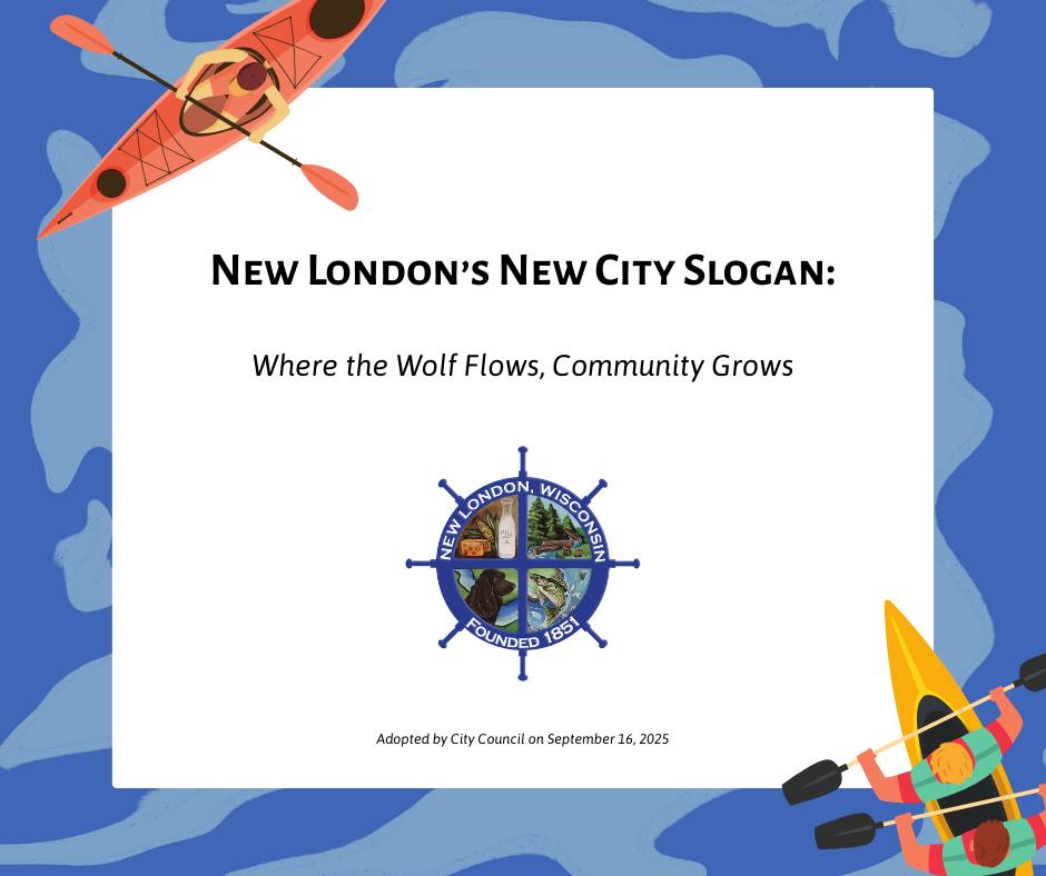 From a community effort emerged a community slogan. As of September 16, 2025 the City of New London has adopted “Where the Wolf Flows, Community Grows” as it’s official slogan.